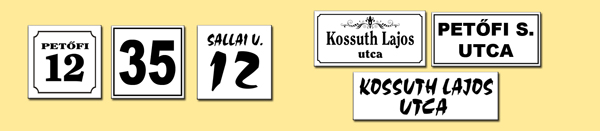 - utcanévtáblák, házszámtáblák műanyag illetve alumínium kivitelben